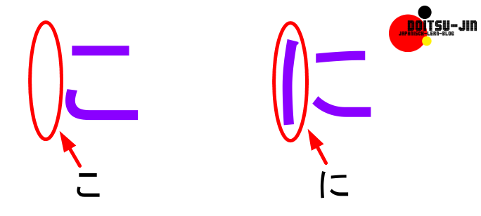 こ (ko) muss OHNE den Strich des Zeichens に (ni) auskommen...